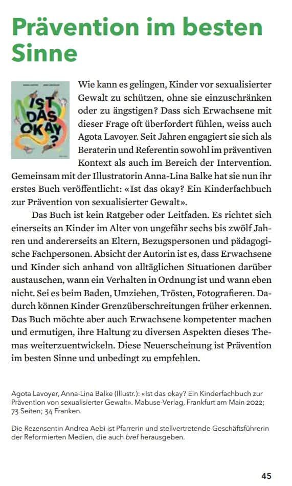 Obwohl ich beruflich regelmässig mit Opfern von sexualisierter Gewalt zu tun habe, diese juristisch berate und in Strafverfahren begleite, wusste ich privat nie so recht, wie ich mit meinen eigenen Kindern über das Thema sprechen soll. Dein Buch, liebe Agota, öffnet Türen, nimmt Hemmungen und bringt das Thema auf leichte Art im Alltag ein. Herzlichen Dank dafür.